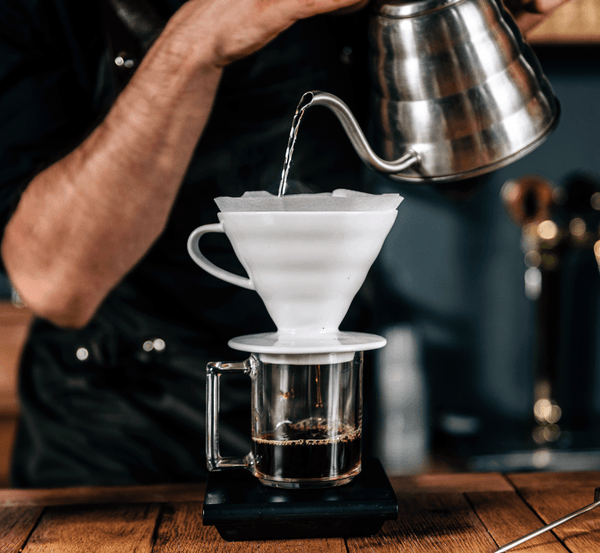 Măcină 18 g de cafea și așază-le uniform într-un filtru de hârtie umezit, așezat într-un con V60.